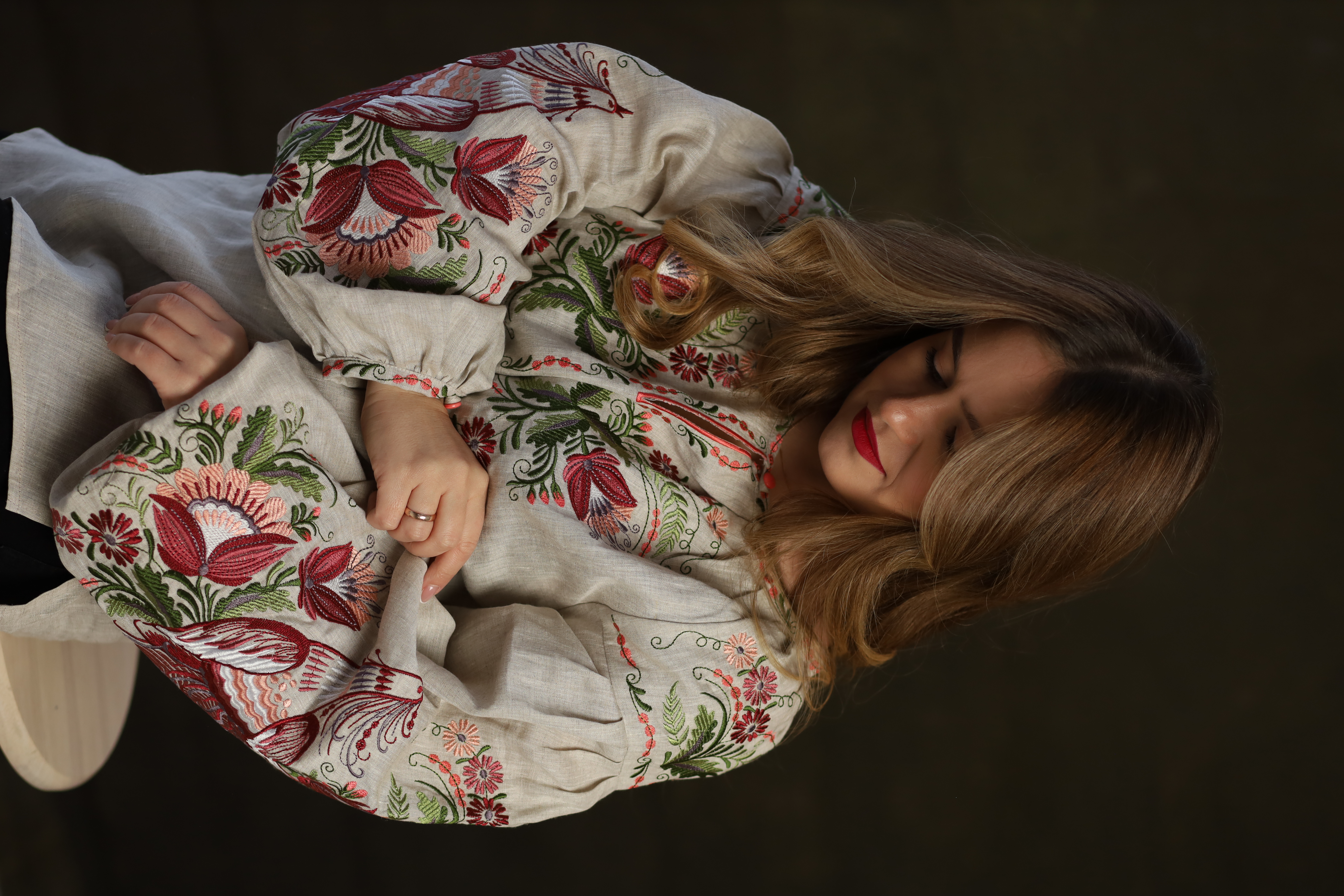 Елегантна біла вишиванка "Птаха" пошита з високоякісного, сірого льону з ніжним візерунком. Модель вільного крою з округлою горловиною , довгими рукавами крою реглан з вузькими манжетами з гудзиками-застібками.